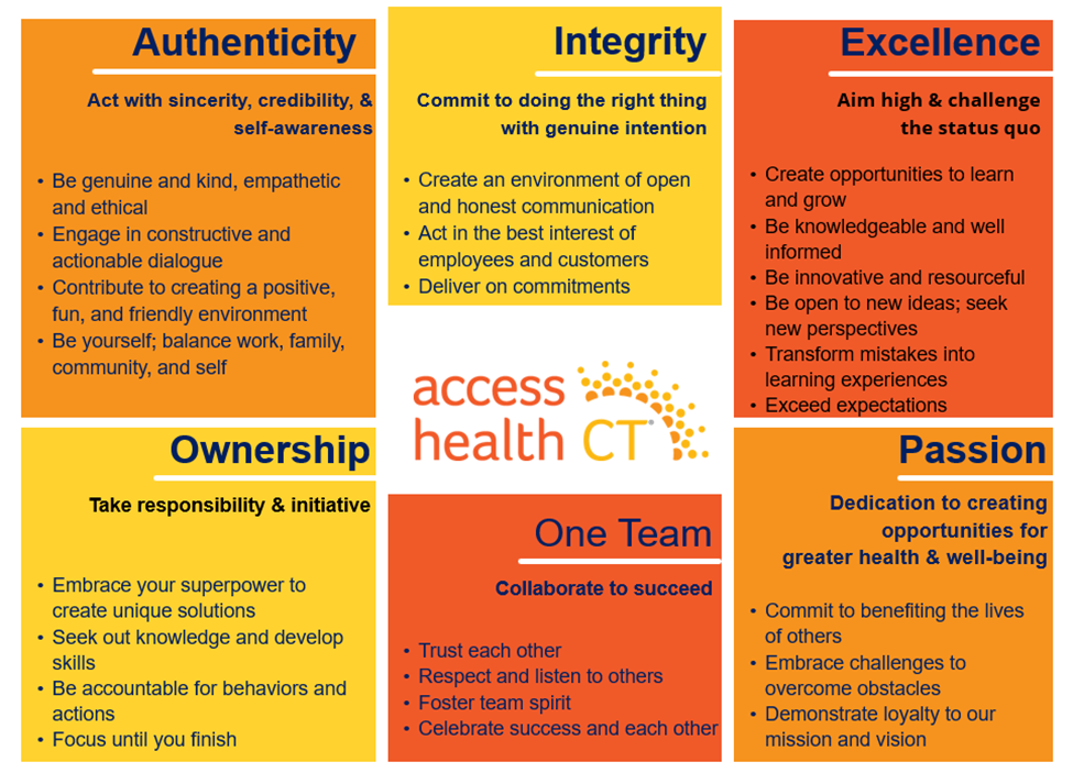 At Access Health CT, we are committed to creating opportunities for greater health and well-being by increasing the number of insured residents in Connecticut. Our Values support this commitment. A group of cross-functional team members of the Values Committee meets regularly to identify, discuss and plan ways to promote Values throughout the organization.